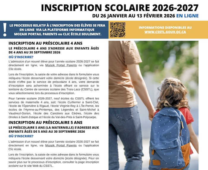 INSCRIPTION AU PRÉSCOLAIRE 4 ANS LE PRÉSCOLAIRE 4 ANS S’ADRESSE AUX ENFANTS ÂGÉS DE 4 ANS AU 30 SEPTEMBRE 2026 OÙ S’INSCRIRE? L’admission d’un nouvel élève pour l’année scolaire 2026-2027 se fait directement en ligne, via Mozaïk Portail Parents ou l’application Clic école. Lors de l’inscription, la saisie de votre adresse dans le formulaire