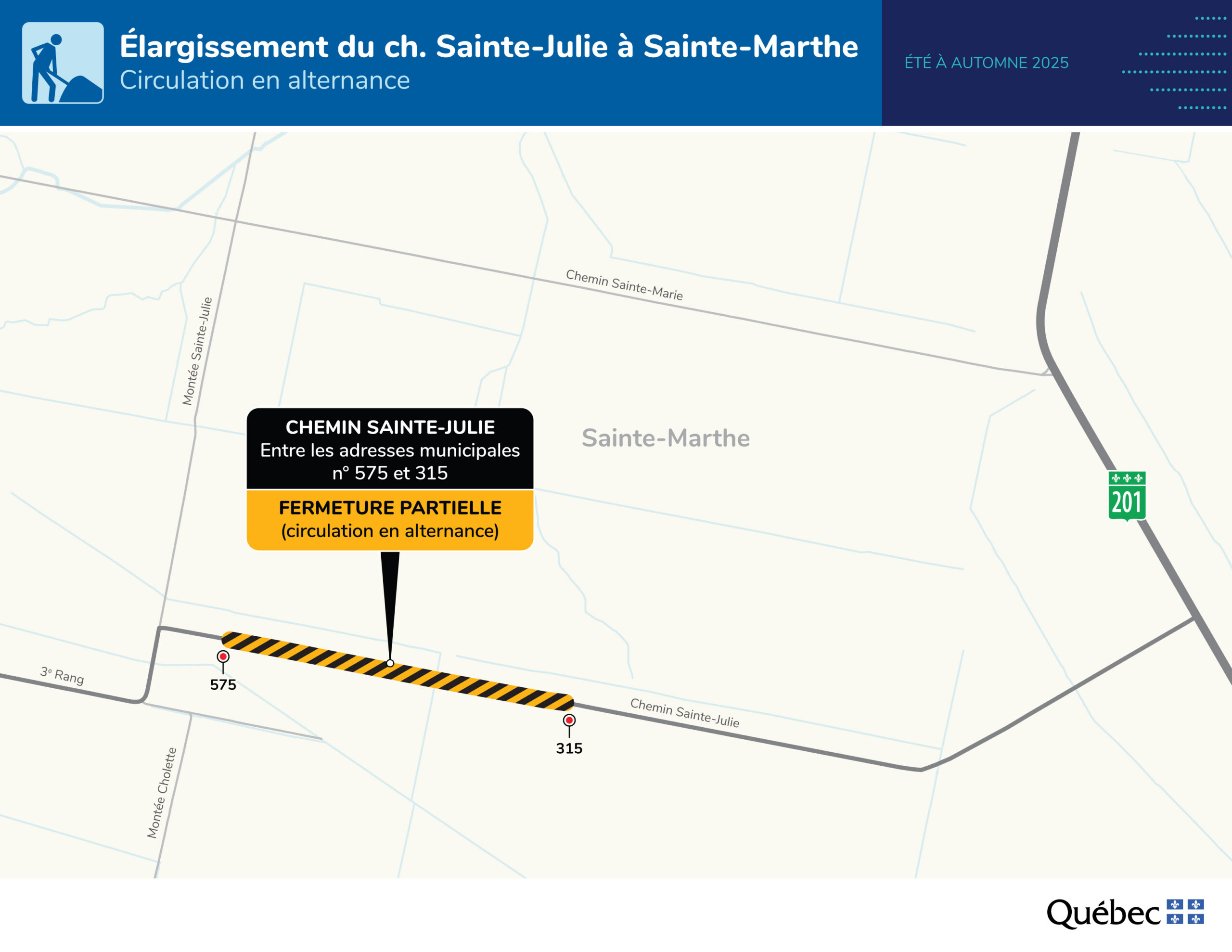 Afin d’atténuer les répercussions pour les usagers, les travaux seront réalisés durant la semaine et par phase. La circulation sera maintenue en alternance pendant toute la durée du chantier. Cependant, des fermetures occasionnelles, principalement durant les fins de semaine, sont à prévoir. De plus, lors du remplacement d’un ponceau, le chemin Sainte-Julie sera complètement fermé à la circulation pour une durée de quelques jours. Les usagers devront emprunter le chemin de détour via la montée Sainte-Julie, la route 201 et les chemins Saint-Guillaume ou Sainte-Marie.