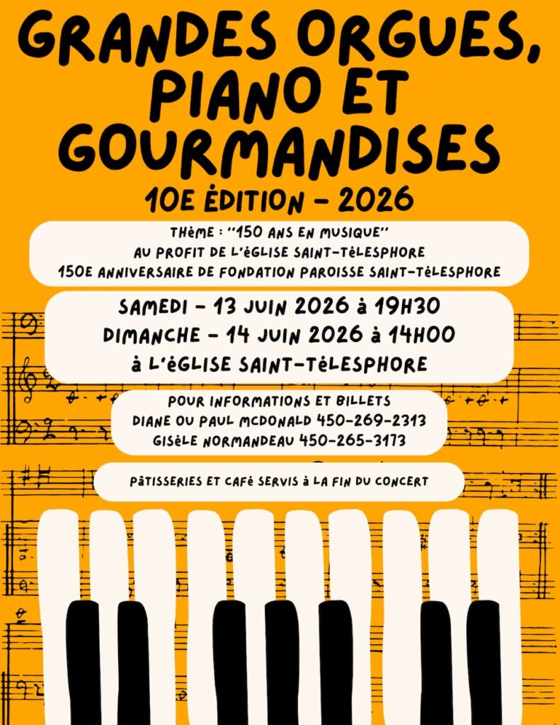 GRANDES ORGUES, PIANO & GOURMANDISES – 10e édition 13/14juin 2026 Screenshot Theme: « 150 ans en musique » Au profit de l’église Saint-Télesphore Pour infos et réservations de billets : Diane ou Paul McDonald : 450-269-2313 Gisèle Normandeau : 450-265-3173 sdst2026-04-13T08:43:33-04:00 Partagez cet article, Choisissez votre Plateforme! FacebookXRedditLinkedInTumblrPinterestVkEmail Articles similaires RABAIS DE 40% SUR LES ANALYSES D’EAU DU 19 AU 26 AVRIL 2026 – Avec procédure d’achat RABAIS DE 40% SUR LES ANALYSES D’EAU DU 19 AU 26 AVRIL 2026 – Avec procédure d’achat avril 20, 2026 Plan climat régional de la MRC de Vaudreuil-Soulanges: un premier forum participatif réussi Plan climat régional de la MRC de Vaudreuil-Soulanges: un premier forum participatif réussi avril 20, 2026 Le CACVS est à la recherche de 15 artistes pour la réalisation d’une œuvre textile qui sera intégrée au centre d’une création collective de type « courtepointe ». Le CACVS est à la recherche de 15 artistes pour la réalisation d’une œuvre textile qui sera intégrée au centre d’une création collective de type « courtepointe ». avril 16, 2026 OFFRE D’EMPLOI – JOURNALIER SAISONNIER OFFRE D’EMPLOI – JOURNALIER SAISONNIER avril 16, 2026 COLLECTE DES BRANCHES – INSCRIPTION OBLIGATOIRE – Semaine du 4 mai 2026 COLLECTE DES BRANCHES – INSCRIPTION OBLIGATOIRE – Semaine du 4 mai 2026 avril 13, 2026