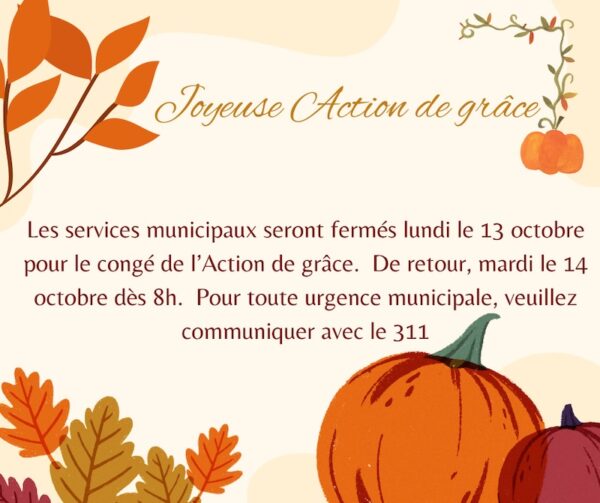 Les services municipaux seront fermés lundi le 13 octobre pour le congé de l’Action de grâce. De retour, mardi le 14 octobre dès 8h.