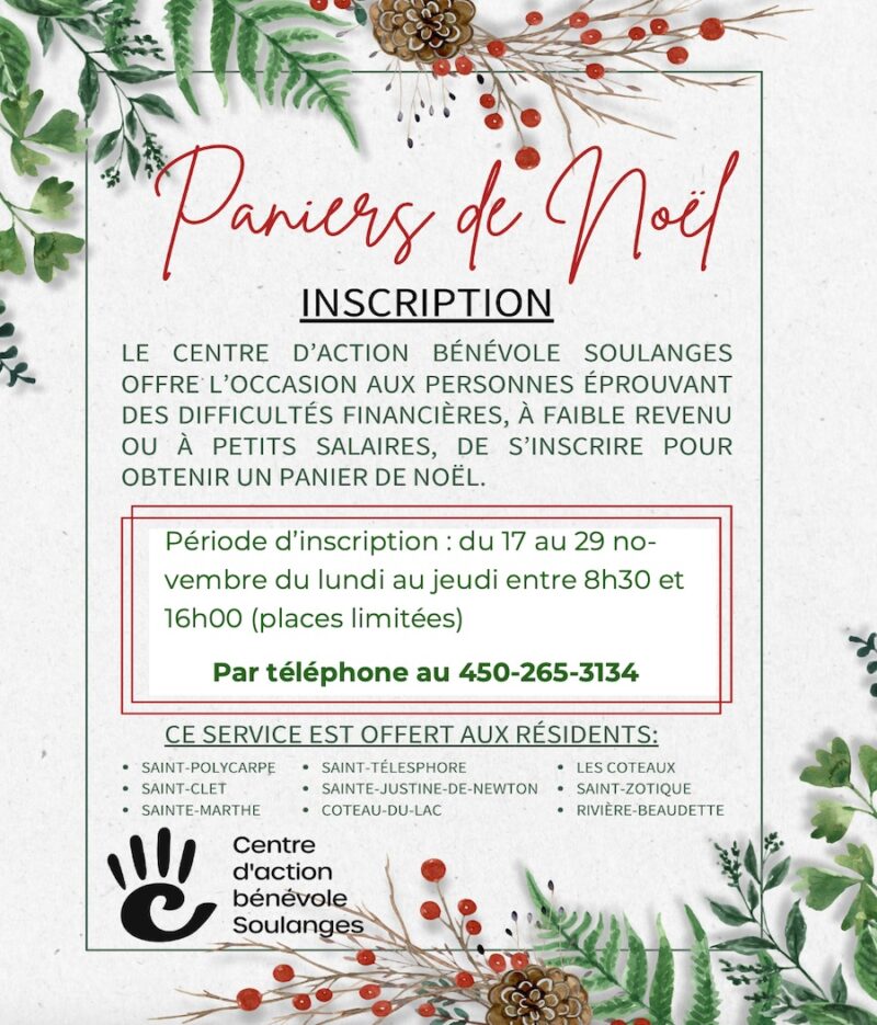 Le Centre d’action bénévole Soulanges est heureux d’annoncer les dates de la période d’inscription pour les paniers de Noël 2025.